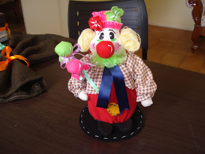 Mais palhaçinhos, servem como lembrança de mesa e a peça em mdf pintada serve também para colocar os bombons.